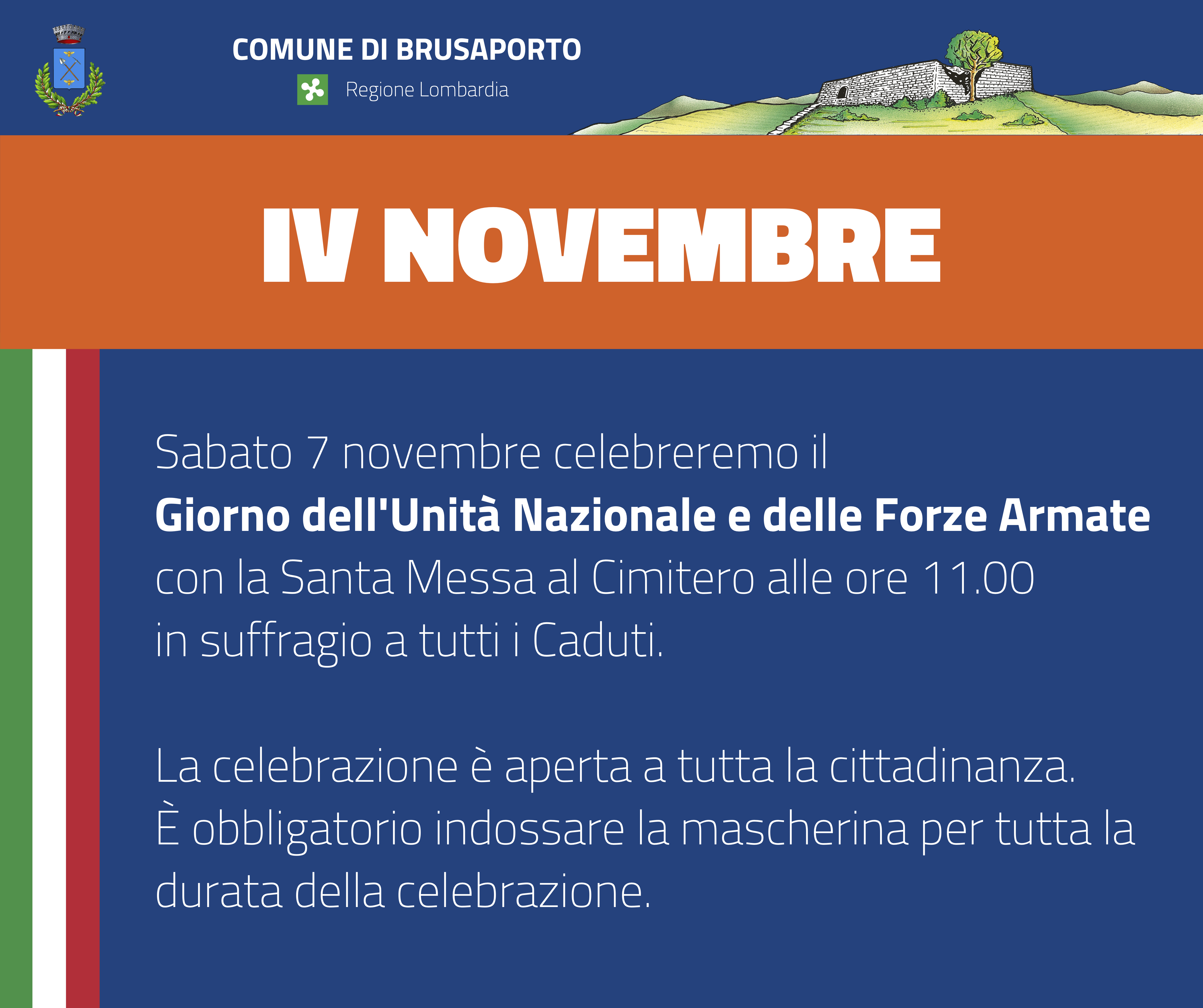 Sabato 7 novembre celebreremo il Giorno dell'Unità Nazionale e delle Forze Armate con la Santa Messa al Cimitero alle ore 11.00 in suffragio a tutti i Caduti.
