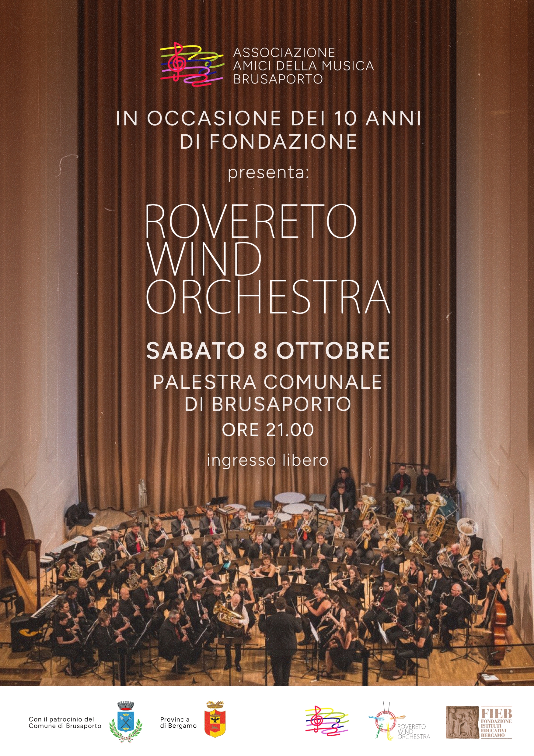Sabato 8 ottobre alle ore 21.00 vi aspettiamo presso la Palestra Comunale per il concerto della "Rovereto Wind Orchestra", organizzato in occasione del decimo anno di fondazione dell'Associazione "Amici della Musica" di Brusaporto.