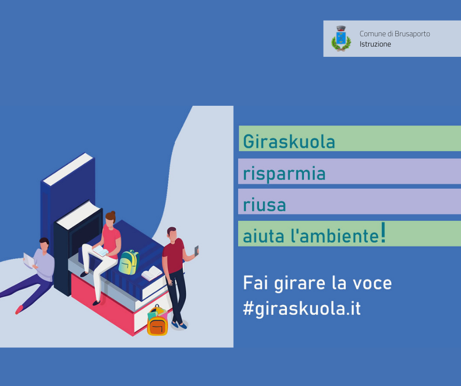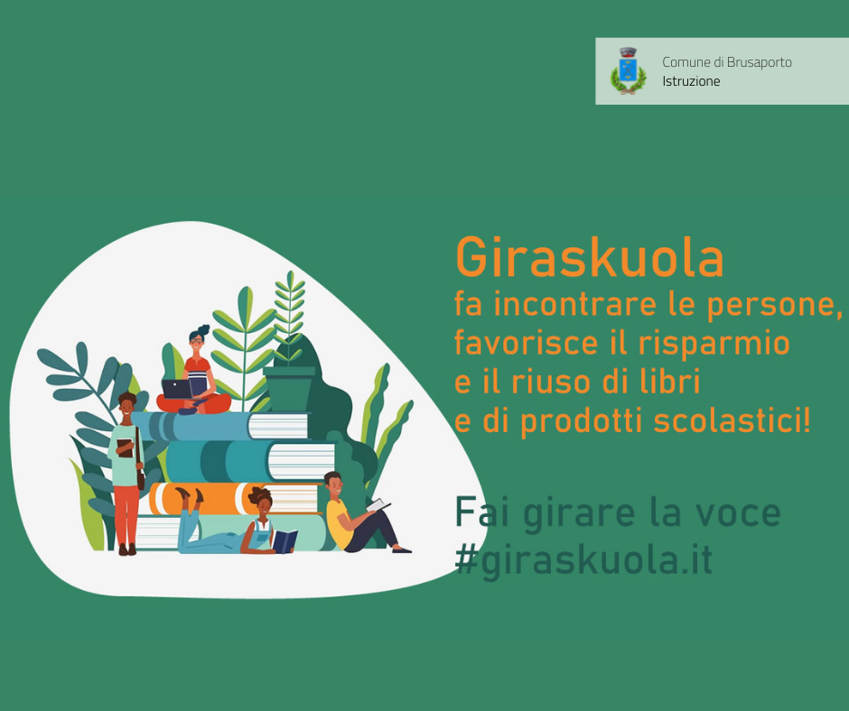 Giraskuola è la piattaforma che mette in contatto chi vuole vendere, acquistare, scambiare, prestare, regalare libri di testo usati, a partire da quelli per le Scuole Secondarie di primo grado fino a quelli adottati alle Scuole Secondarie di secondo grado, e materiale scolastico. La piattaforma è offerta gratuitamente dal Comune di Brusaporto ai propri cittadini come servizio utile, ecologico e virtuoso.